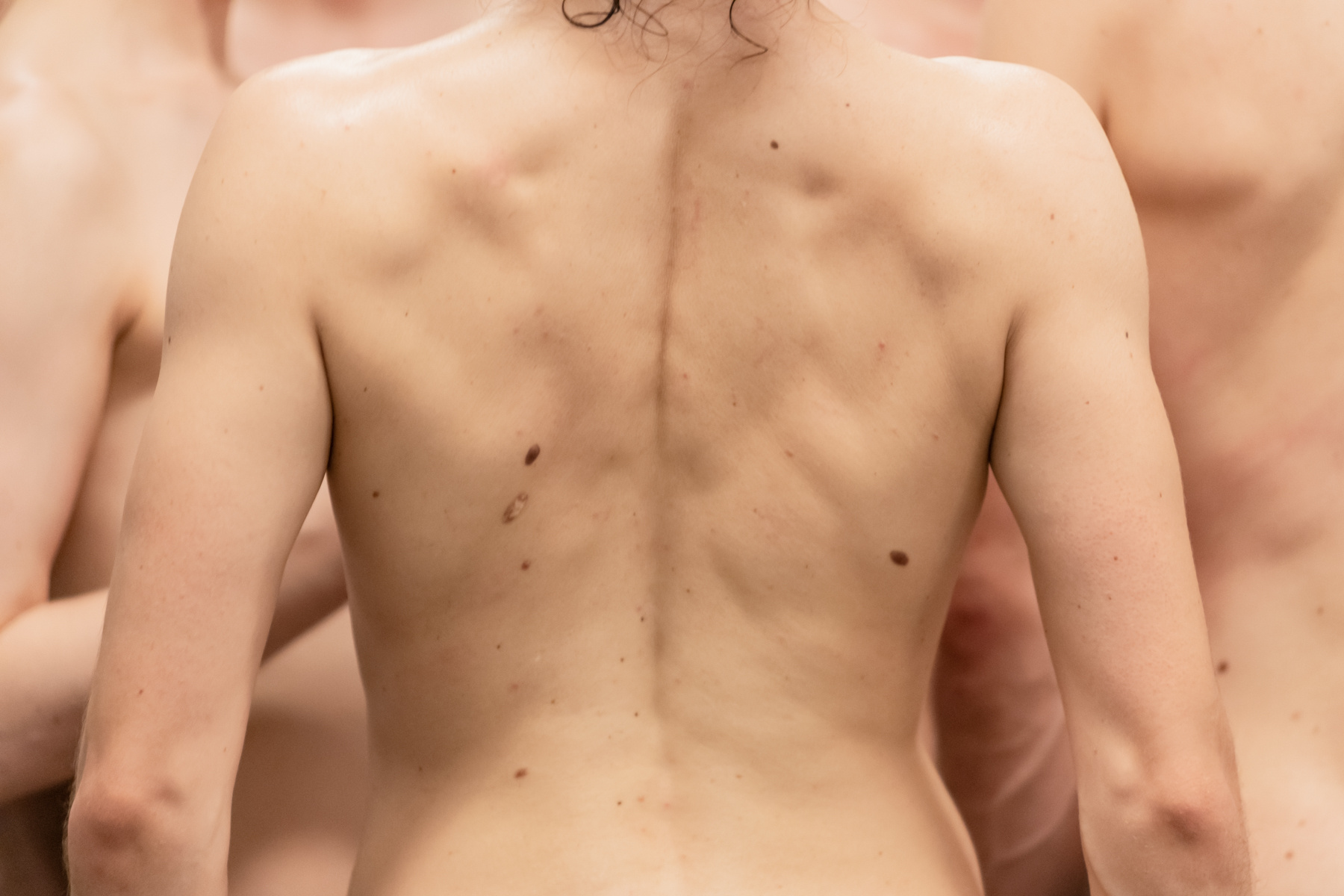 sklope, vrste, kolone, ponovitve, kanone in dodajam pavze. Red me pomirja in me hkrati nervira. Sem človek discipline. V maniri popolnosti lovim bistvo lastne nepopolnosti. Da ujamem manjkajočo četrtino. Verjamem v tradicijo - referenčne točke, ki nas držijo skupaj. Zato vzamem osem osvobojenih teles. Uredim jih v sklope, vrste, kolone, ponovitve, kanone in pavze. Slečem jim vse odvečno in jih izpostavim harmoniji. Živi zid enakosti vzpostavi režim ravnovesja med redom in kaosom. Skupaj štejemo do tri. Ena. Dva. Tri. Ob misli na štiri se spotaknemo. Zagrizemo znova in misel nas zmeraj znova ugrizne nazaj. Do krvi in mesa. Ker korak ni nikoli samo korak. Ker ples ni nikoli samo ples. Telo pa je vedno le telo.